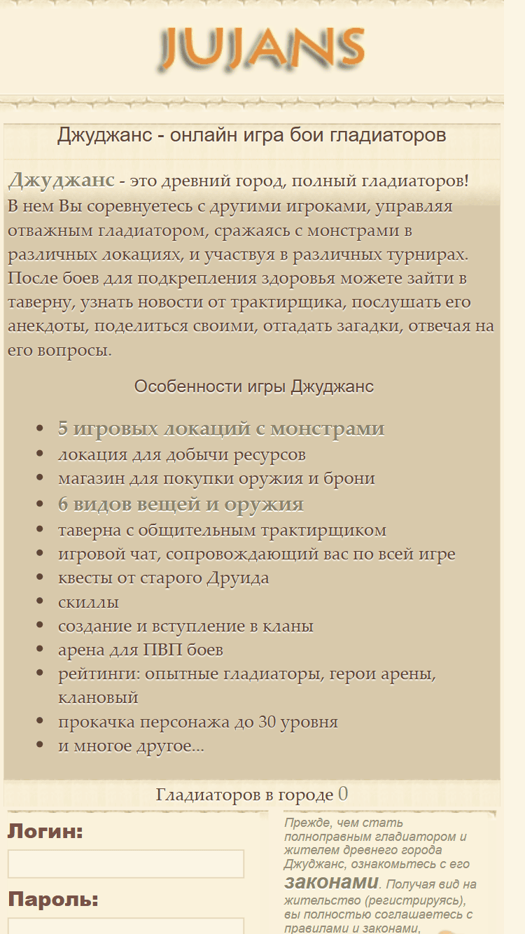 Джуджанс - это древний город, полный гладиаторов! В нем Вы соревнуетесь с другими игроками, управляя отважным гладиатором, сражаясь с монстрами в различных локациях, и участвуя в различных турнирах. После боев для подкрепления здоровья можете зайти в таверну, узнать новости от трактирщика, послушать его анекдоты, поделиться своими, отгадать загадки, отвечая на его вопросы.