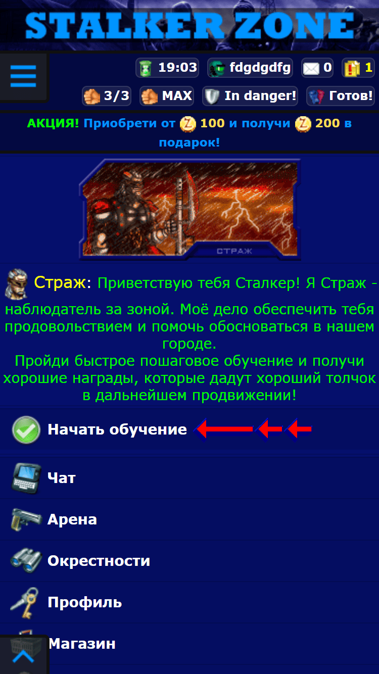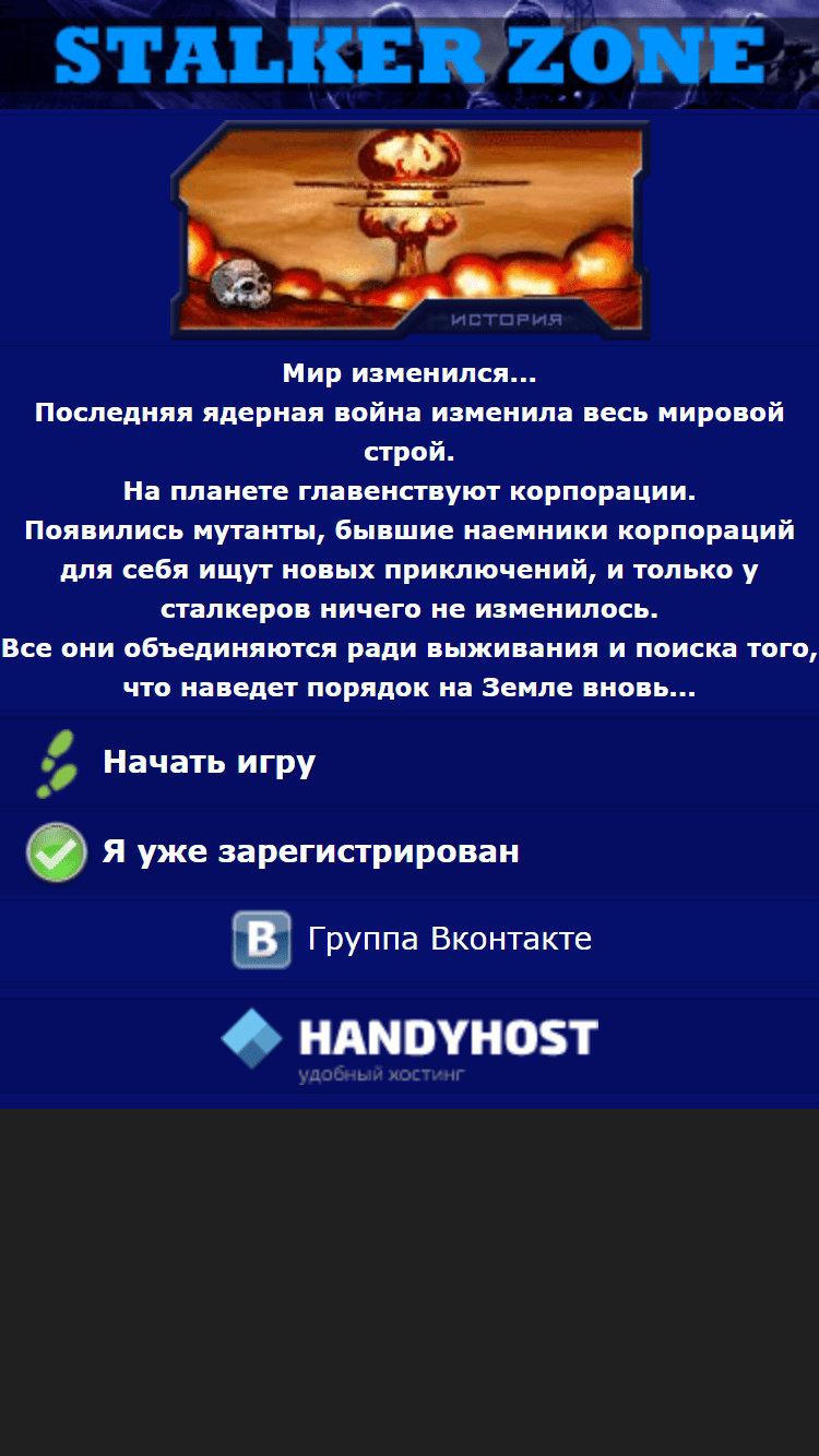 Мир изменился... После ядерной войны выжившие продолжают бороться за жизнь в этом мире. Вступи в борьбу и ты. Построй жилище, купи себе снаряжение, улучшай свои навыки. Бейся на арене, охоться на мобов, работай на поле, ищи артефакты, копай руду, стань самым лучшим патрулём. Докажи всем что ты лучший, выбейся в топ рейтинга и вступи в клан. Куча ивентов, много приключений, неоспоримый интерес - всё это ждёт тебя в онлайн игре Stalker : Zone Возрождение легенды. Стань легендой - вступи в игру!