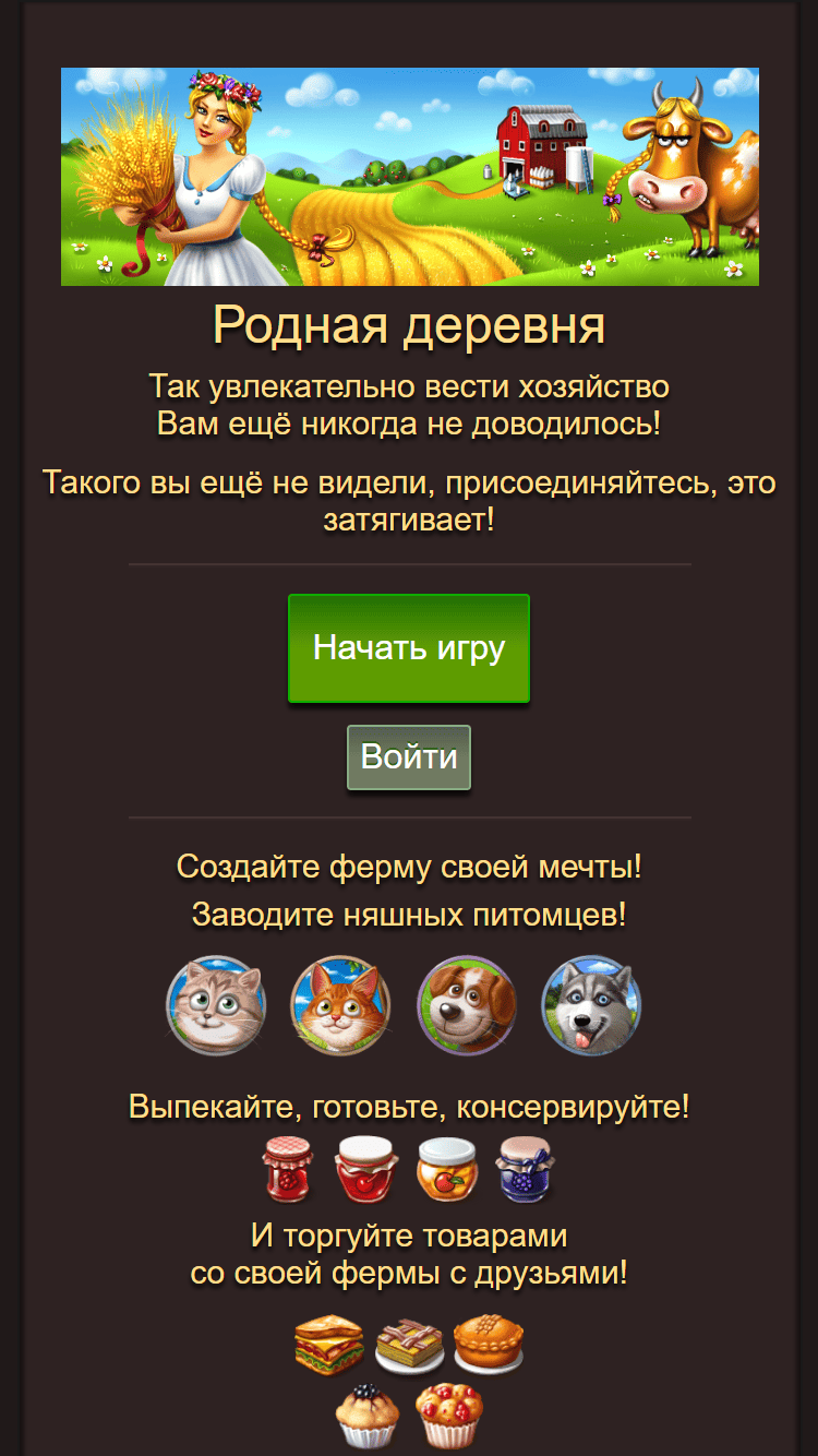 Онлайн игра Родная Деревня – аналог Веселой Фермы, которая в свое время захватила Интернет. В качестве дара от брата родителей игроку достается приусадебное хозяйство. На полях уже растут кое-какие посадки. Первое, что нужно сделать – их собрать. Далее можете начинать обустраивать владения.