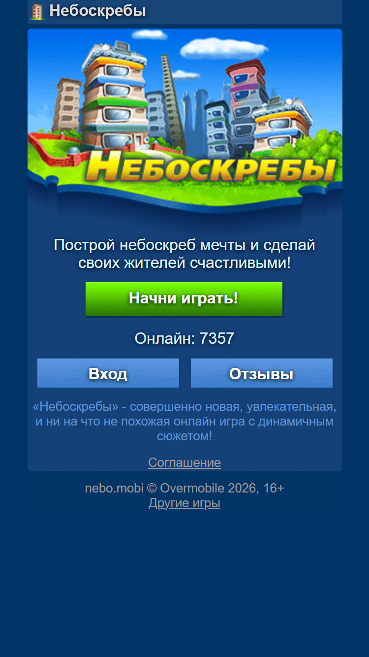 Онлайн игра Небоскребы относится к жанру «бизнес» и предлагает тебе построить самый высокий бизнес-центр. Как только пользователь начинает игру, он попадает на первые этажи центра и может начать обустраиваться. Здесь приятная графика, хорошо продуманный геймплей и множество союзников.